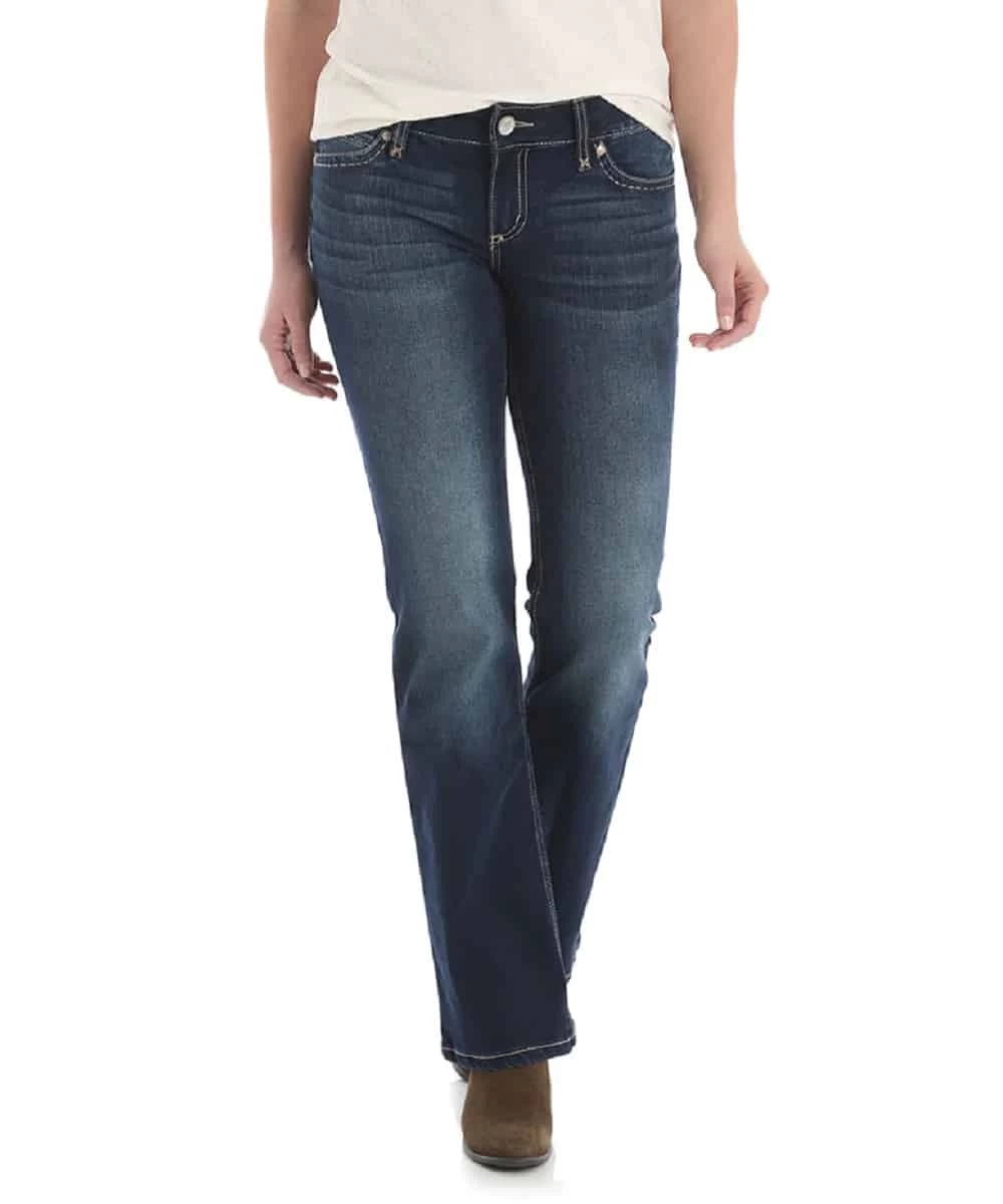 61% Cotton/23% Rayon/15% Polyester/1% Spandex; Mid-Rise; Flatters Curves; Contour Waist; Five Pocket Styling; Fading; Whiskering; Brown Pocket Stitching; Wrangler Logo On Back Pockets; Boot Cut; Color: Dark Blue; Style #09MWZHT